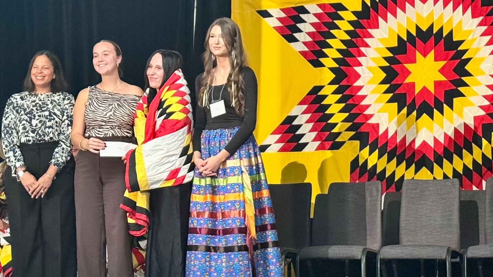 Jorja Johnson from Fisher River Cree Nation and currently attending Oak Park High School was recognized under Community/Volunteerism Junior. Teurauna Russo from Sandy Bay First Nation and currently attending Oak Park High School was awarded for Artistic Performance. Mila Gaslard from God's Lake Narrows and currently attending Oak Park High School received the Health North award. All three recipients are members of the Oak Park High School Medicine Wheel Club with teacher advocates Roberta Anderson, Derek Fraser and Melanie Jones.